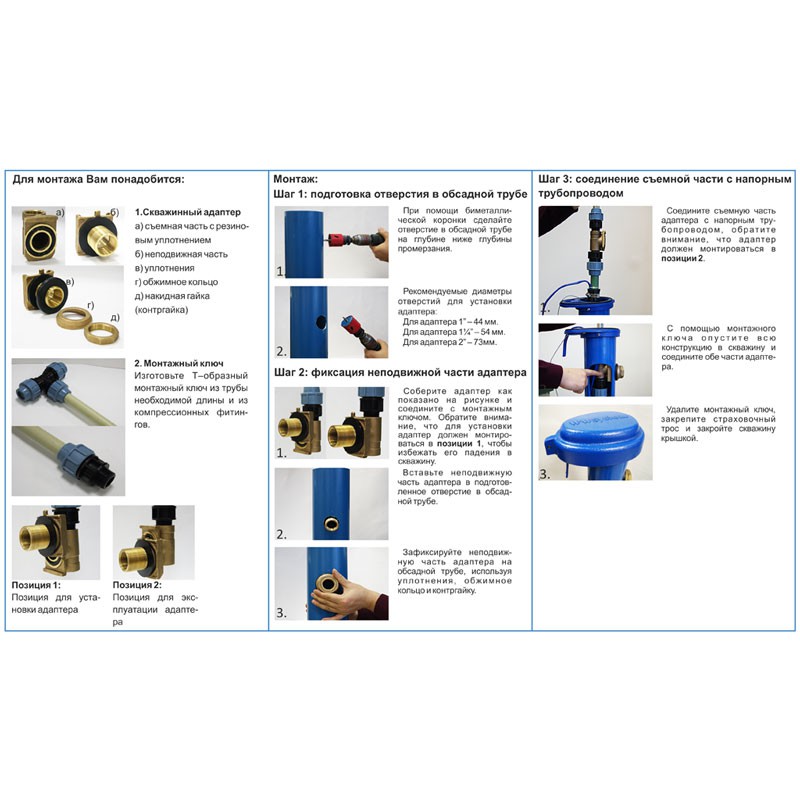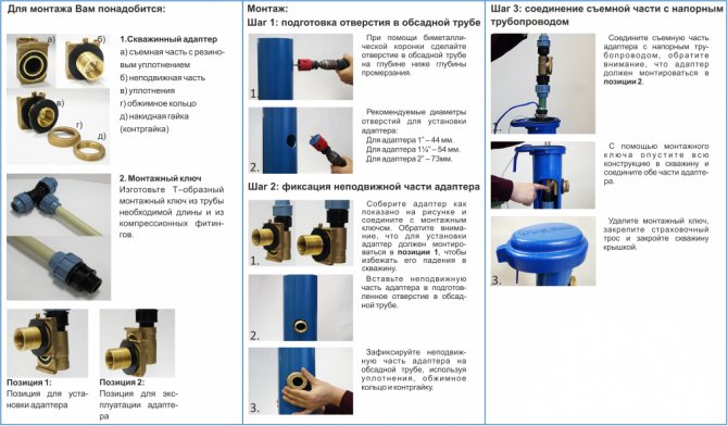 Une telle procédure améliore la qualité d'assemblage du module de pression et exclut la pénétration de terre dans les cavités de l'unité hydraulique. Lors de l'aménagement d'un puits avec un adaptateur, il convient de tenir compte du fait que la partie saillante de la partie extérieure impose des restrictions sur le diamètre de la pompe.
