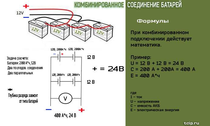 Alors, une batterie avec paramètres de tension 12 volts et un courant de 200 ampères, peuvent générer 2400 watts (2,4 kW). Pour calculer la puissance totale de plusieurs batteries, il faut additionner les valeurs obtenues pour chacune d'elles.