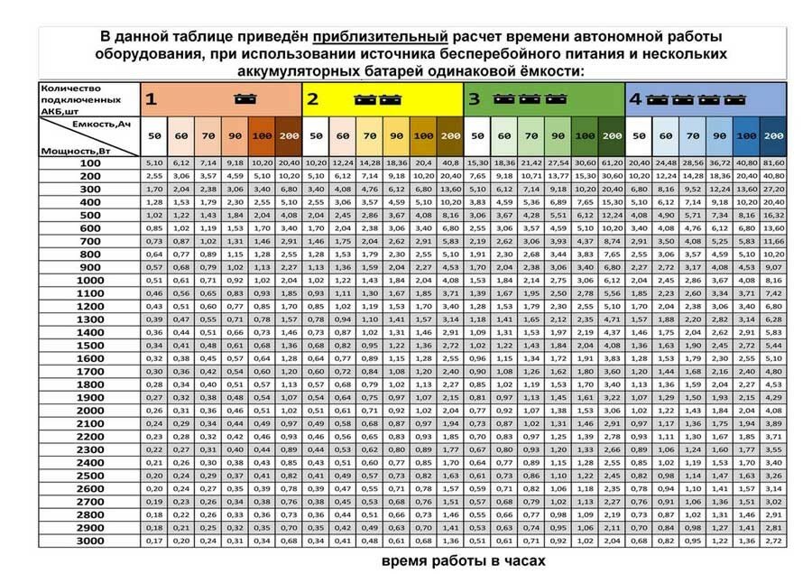 Les instructions pour la batterie indiquent qu'il n'est pas souhaitable de la décharger de plus de 20% de la capacité totale. Autrement dit, dans l'obscurité, seuls 0,164 kWh peuvent être prélevés sur la batterie sans conséquences. La décharge normale de la batterie devrait se produire dans les 20 heures.Si ce processus se produit sous l'influence d'un courant élevé, la capacité diminuera encore plus. Ainsi, le courant de décharge le plus optimal sera de 5 A et la puissance de sortie de la batterie sera de 60 W. Si vous avez besoin de résoudre le problème, comment calculer la puissance avec une valeur augmentée, dans ce cas le nombre de batteries augmente ou le mode de fonctionnement des appareils existants change.