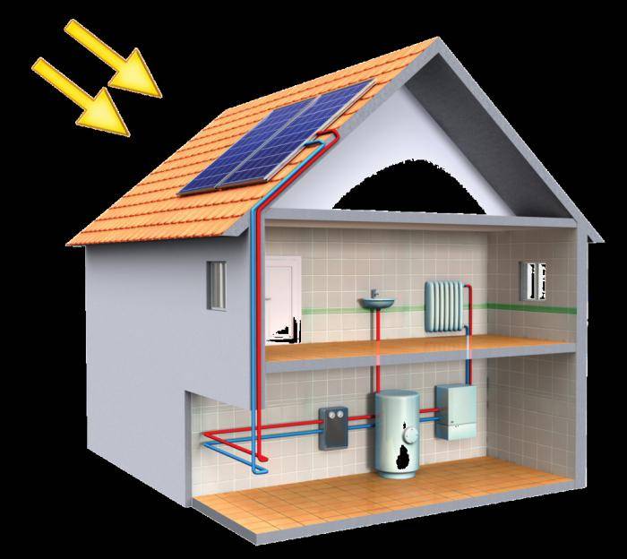 Les sources de chauffage alternatives solaires d'une maison de campagne - les capteurs, sont des plaques installées sur le toit d'un bâtiment. Ils collectent la chaleur solaire et transfèrent l'énergie accumulée à la chaufferie au moyen d'un caloporteur.Un échangeur de chaleur est installé dans le réservoir de stockage, dans lequel la chaleur entre. Après ce processus, l'eau est chauffée, ce qui peut être utilisé non seulement pour chauffer la maison, mais également pour divers besoins domestiques. Les technologies modernes ont permis à ces types alternatifs de chauffage d'une maison privée de collecter de la chaleur même par temps humide ou nuageux.