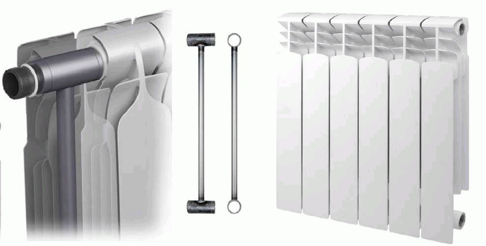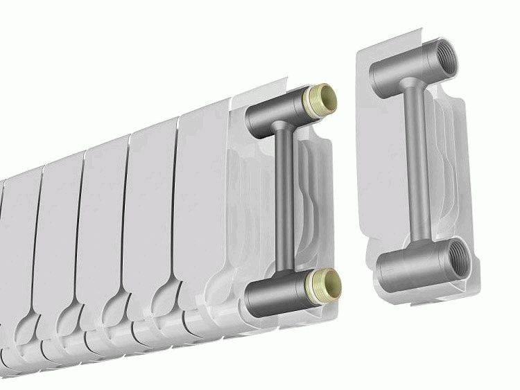 Les radiateurs bimétalliques sont une armature constituée de tubes creux en acier ou en cuivre (horizontaux et verticaux), à l'intérieur desquels circule le liquide de refroidissement. À l'extérieur, des plaques de radiateur en aluminium sont fixées aux tuyaux. Ils sont fixés par soudage par points ou moulage par injection spécial. Chaque section du radiateur est reliée à l'autre par des mamelons en acier avec des joints en caoutchouc résistants à la chaleur (jusqu'à deux cents degrés).