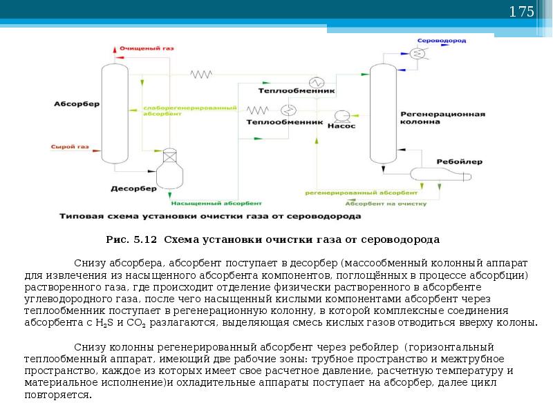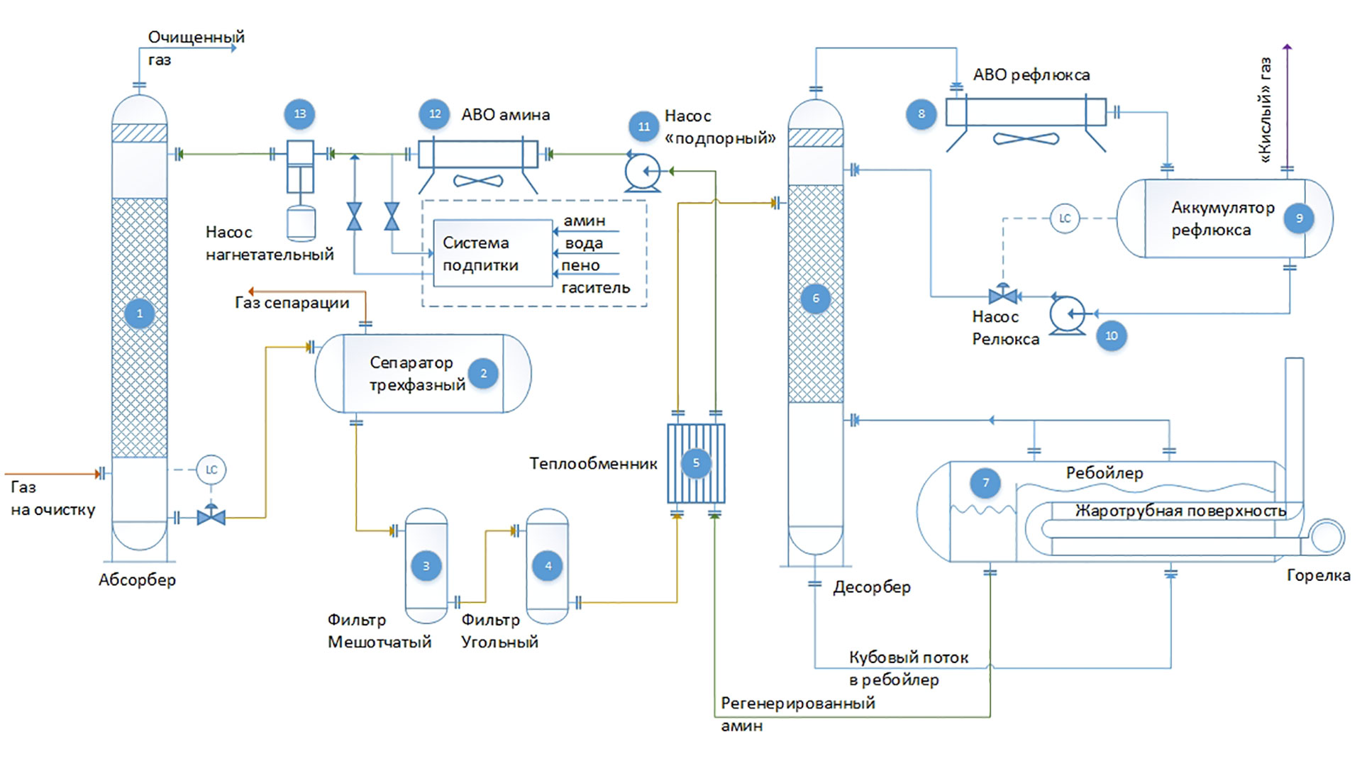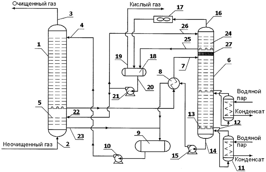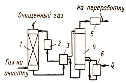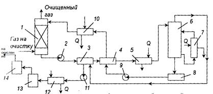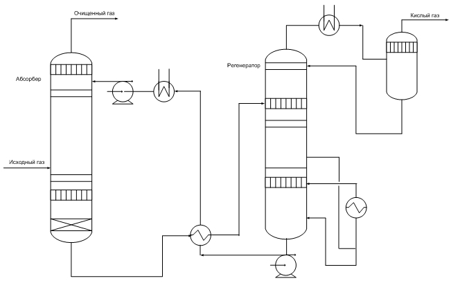 La figure montre le schéma principal à flux unique de nettoyage des gaz d'absorption avec des solutions d'éthanolamine. Le gaz amené à l'épuration passe en flux ascendant à travers l'absorbeur vers le flux de la solution. La solution saturée en gaz acides du bas de l'absorbeur est chauffée dans l'échangeur de chaleur par la solution régénérée du désorbeur et amenée au sommet du désorbeur.
