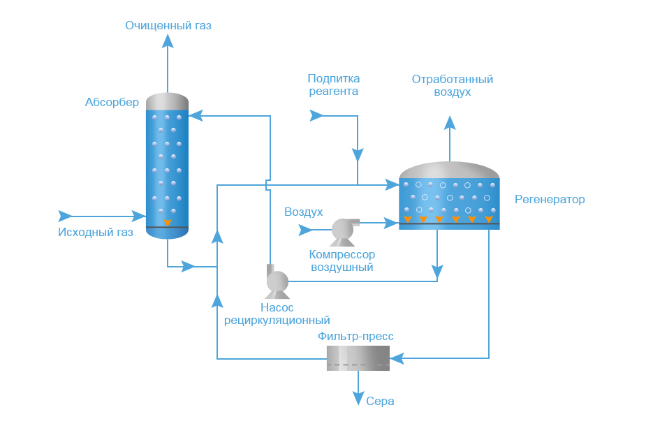 Si le gaz à purifier dans l'installation est sous une pression suffisante pour permettre au réactif de passer dans l'échangeur de chaleur puis dans la colonne de stripage, le processus se déroule sans la participation d'une pompe. Si la pression n'est pas suffisante pour le flux du processus, la sortie est stimulée par la technologie de pompage