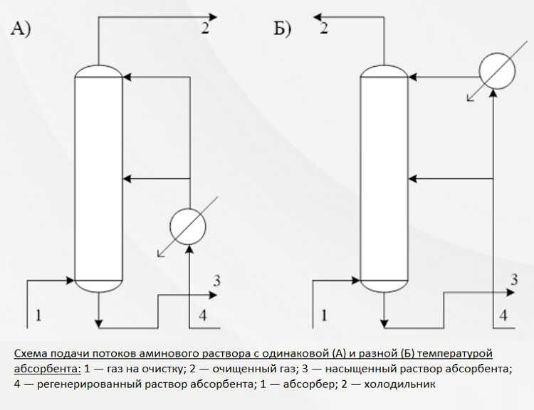 La deuxième et la troisième des méthodes décrites prédéterminent l'alimentation de la solution absorbante en deux flux. Dans le premier cas, le réactif est servi à la même température, dans le second - à des températures différentes.