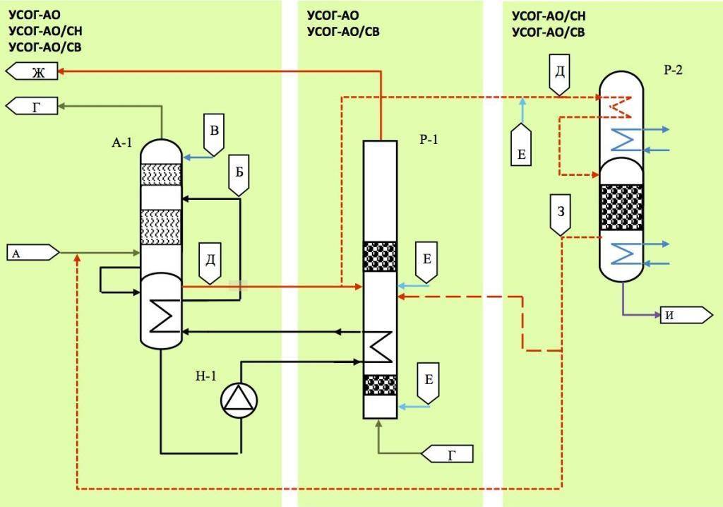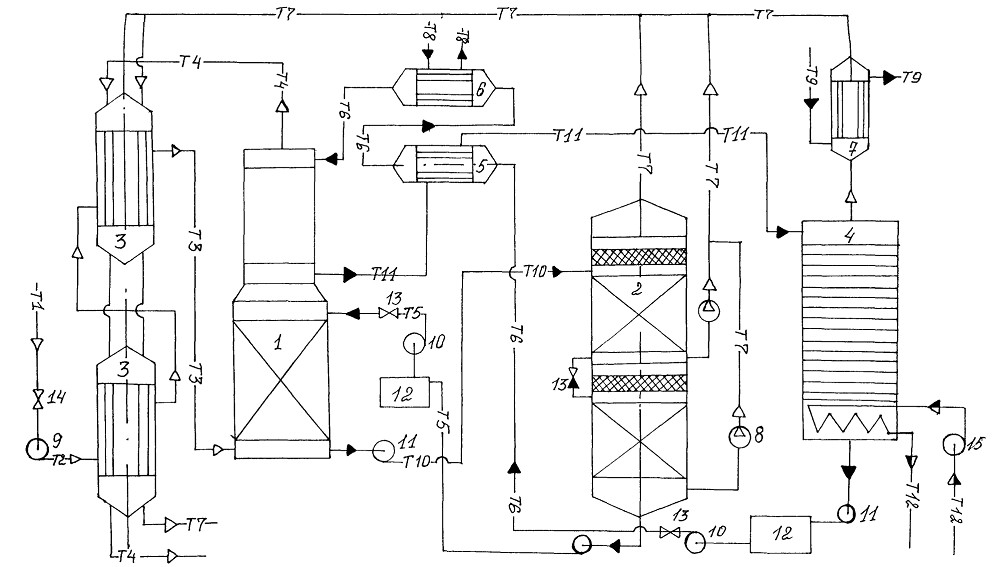 Première voie. Prédétermine l'alimentation de la solution active dans un flux d'en haut. Tout le volume de l'absorbant est envoyé vers le plateau supérieur de l'appareil. Le processus de nettoyage a lieu à une température de fond ne dépassant pas 40ºС.