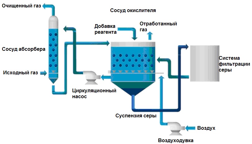 Tout d'abord, le combustible gazeux est nettoyé avec une composition forte avec une teneur en réactif de 25 à 35%. Ensuite, le gaz est traité avec une solution aqueuse faible, dans laquelle la substance active n'est que de 5 à 12%. En conséquence, le nettoyage grossier et fin est effectué avec une consommation minimale de solution et une utilisation raisonnable de la chaleur générée.