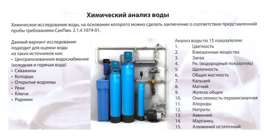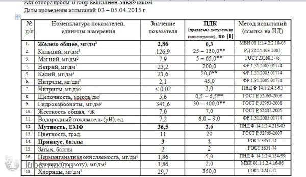 Les exigences relatives à la qualité de l'eau potable sont établies par les normes, énoncées point par point, et toutes serviront de ligne directrice lors de l'analyse. Le client peut lui-même demander une analyse en raison d'une mauvaise filtration (s'il lui semble que le système ne s'en sort pas et qu'il faut choisir un filtre différent), si du sable se trouve dans l'eau, si son goût a changé, etc. Mais même sans de telles « plaintes », l'analyse peut être un test utile.