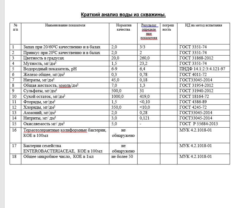 Les puits jusqu'à 30 m de profondeur ont également une faible minéralisation, mais beaucoup de fer, de chlorures et d'azote - une analyse approfondie (chimique et bactériologique) est nécessaire. À une profondeur de 30 à 70 m, la quantité de sels de calcium et de magnésium dans l'eau augmente (sa dureté augmente), ainsi que les sulfates de fer. Sur la base des résultats de l'analyse, des bactéries de sulfure d'hydrogène peuvent également être trouvées.