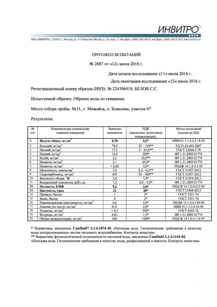 Les spécialistes EKVOLS qui analysent l'eau des puits et d'autres sources ont plus de dix ans d'expérience. Leur professionnalisme, l'utilisation d'équipements modernes et de réactifs éprouvés sont une garantie de la rigueur de l'étude et de l'obtention d'un résultat fiable. Tous les travaux, de la prise d'eau à la source jusqu'à sa recherche en laboratoire, respectent pleinement les exigences réglementaires du SNiP et du SanPiN. La base de l'analyse est la principale institution chimique et technologique de Russie - RKhTU im. D. I. Mendeleïev.