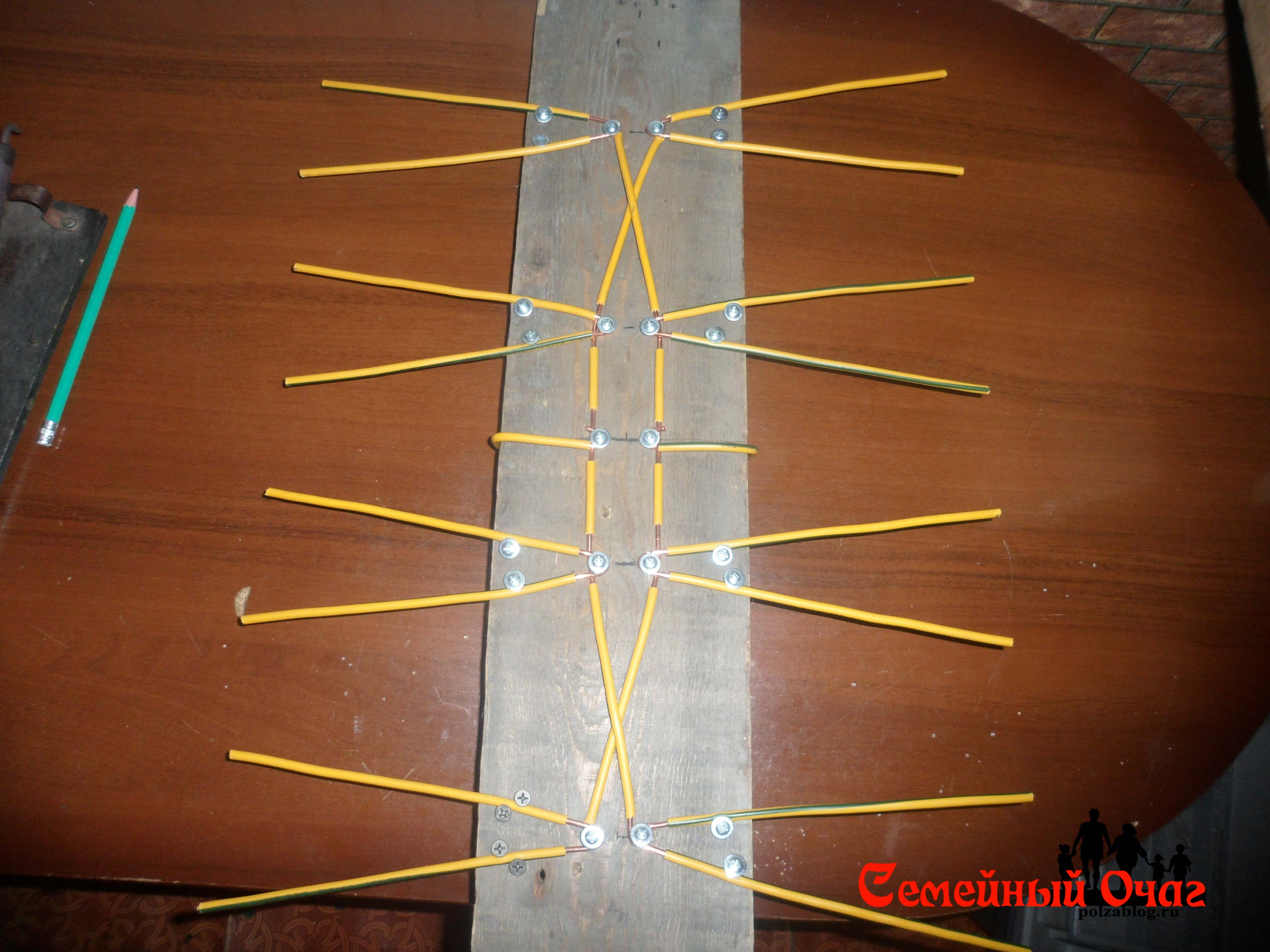 4) Anneaux finis - c'est la base de la future antenne - vous devez le fixer sur un petit morceau de contreplaqué. Au lieu de contreplaqué, vous pouvez utiliser n'importe quel morceau de bois approprié. L'arbre ne doit pas chevaucher les anneaux, ni pendre, de sorte que toute l'antenne soit clairement fixée sur le toit.