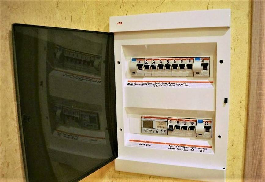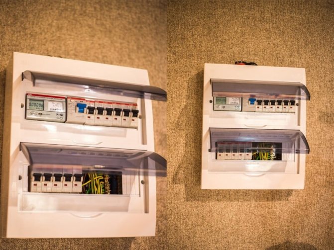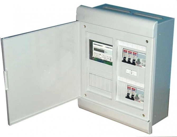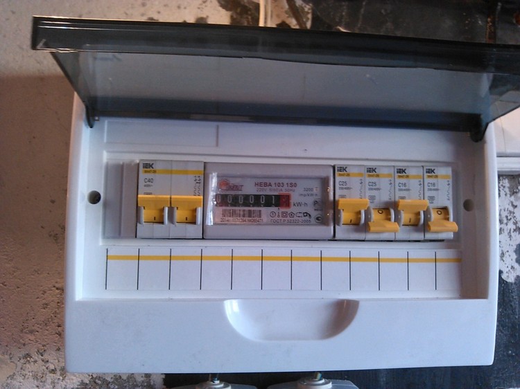 Un disjoncteur est installé dans le coffret devant le comptoir. Ses paramètres doivent être calculés à partir de la puissance totale de tous les consommateurs - appareils électriques installés ou prévus dans la maison et dans la rue / dans le garage et autres bâtiments domestiques.