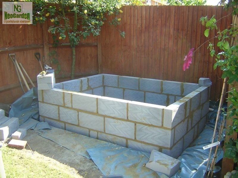 Pour se simplifier la vie, de nombreux résidents estivaux se livrent à des tours de passe-passe. Ne voulant pas s'occuper de coffrage et de mortier de béton, certains utilisent des blocs de béton prêts à l'emploi. Dans ce cas, le processus d'installation se résume à couler une base plate et à monter les murs des blocs. Ils sont fixés avec du mortier et chaque troisième rangée est renforcée par un treillis. Après tout cela, il reste à réaliser l'imperméabilisation et la finition.