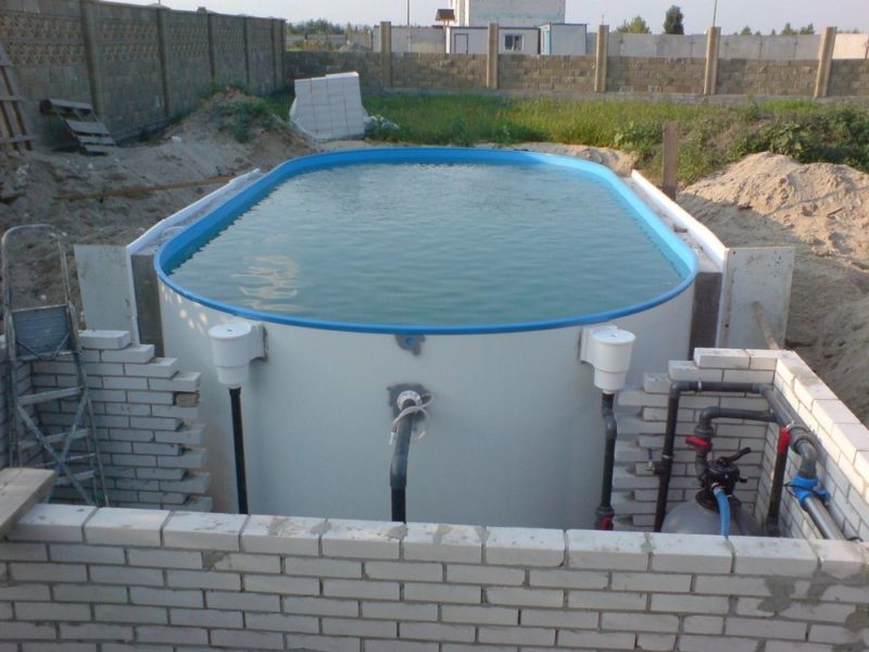Une structure assez simple, tout à fait adaptée à l'auto-construction, est considérée comme une piscine à ossature. Sa caractéristique est la conception, qui consiste en un cadre "squelette" de tuyaux métalliques. Le bol est doublé de trois couches de film PVC. À l'intérieur, il y a une maille spéciale en nylon, qui donne au matériau une résistance à la traction supplémentaire. Le cadre en métal maintient la pression de l'eau.