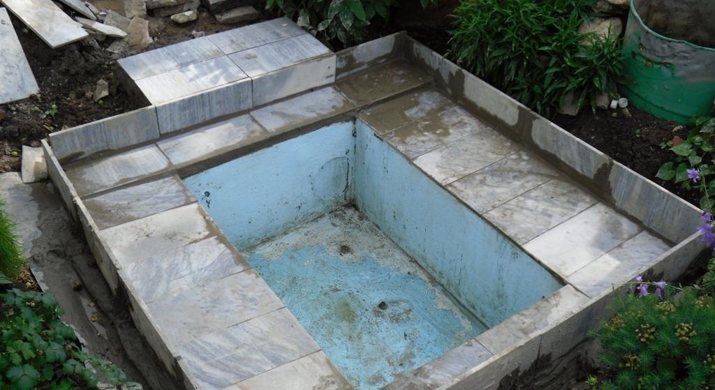 Une fois le béton durci, le coffrage est retiré et la surface intérieure du réservoir résultant est recouverte d'un mortier de ciment liquide avec des additifs spéciaux, qui fournit une imperméabilisation supplémentaire. Après le mur, les vasques sont tapissées de mosaïques ou de carreaux.