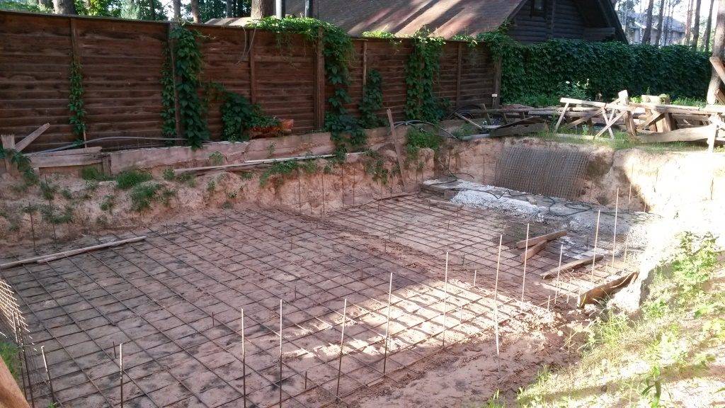 Le renforcement de la piscine est réalisé avec des tiges nervurées d'un diamètre de 10-14 mm et des cellules de 20 x 20 cm, qui sont posées sur de petites pierres. L'étape de pose est de 20 cm, il faut reculer de 5 cm du bord de la dalle et plier les tiges avec la lettre "G" (ces coudes seront nécessaires pour créer l'ossature du mur).