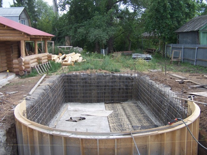 Pour le coffrage, on utilise des panneaux et du contreplaqué résistant à l'humidité, qui sont recouverts de composés protecteurs. Tout d'abord, le fond de la piscine est coulé et, une fois le cadre installé, la cuvette en béton est coulée. Pour la résistance, un renfort est utilisé, qui est attaché avec du fil ou soudé si le réservoir a une configuration complexe.