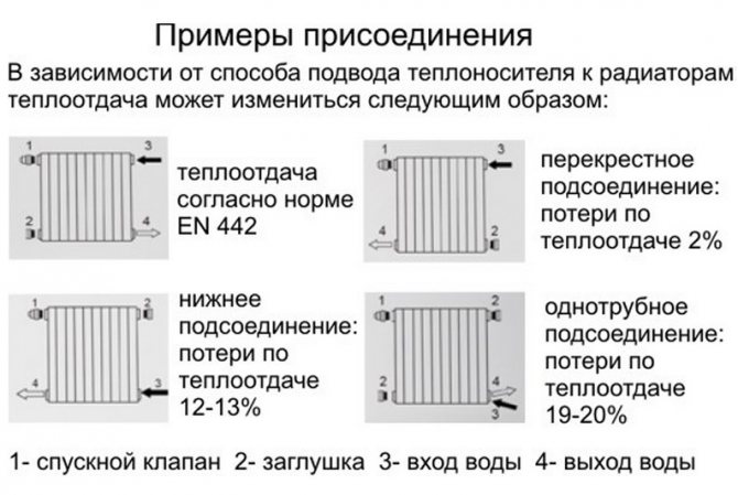 Il y a quatre sorties pour le radiateur avec connexion latérale. Deux d'entre eux sont occupés par les conduites d'alimentation et de retour, sur le troisième ils ont mis une grue Mayevsky. La quatrième entrée est fermée par un bouchon. Comme la plupart des batteries modernes, elle est le plus souvent peinte avec de l'émail blanc et ne gâche en rien l'apparence.