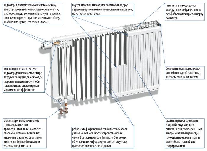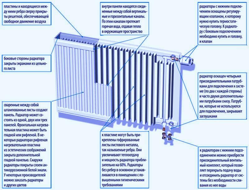 Les panneaux en acier présentent également quelques différences, mais uniquement en termes de suspension - des supports sont inclus avec eux, et sur le panneau arrière, il y a des manilles spéciales en métal moulé avec lesquelles le radiateur s'accroche aux crochets des supports.