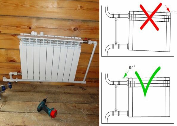 Si dans le système de chauffage le liquide de refroidissement se déplace selon les lois naturelles, la batterie doit être montée uniquement horizontalement. Dans le même temps, il n'est pas nécessaire d'installer un évent (grue Maevsky) dessus.