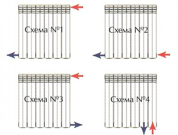 • Diagonale. Dans la plupart des cas, il est utilisé lors de la connexion d'appareils de chauffage à plusieurs sections. Une caractéristique distinctive est la connexion des pipelines. Ainsi, l'alimentation est connectée au futorka supérieur d'un côté du radiateur et le retour est connecté au futorka inférieur de l'autre côté. Dans le cas d'une connexion en série, le liquide de refroidissement se déplace sous la pression du système de chauffage. Des grues Mayevsky sont installées pour évacuer l'air. L'inconvénient d'un tel système se révèle lorsqu'il est nécessaire de réparer la batterie, car l'installation de batteries de chauffage central de cette manière n'implique pas la possibilité de retirer les batteries sans arrêter le système ;