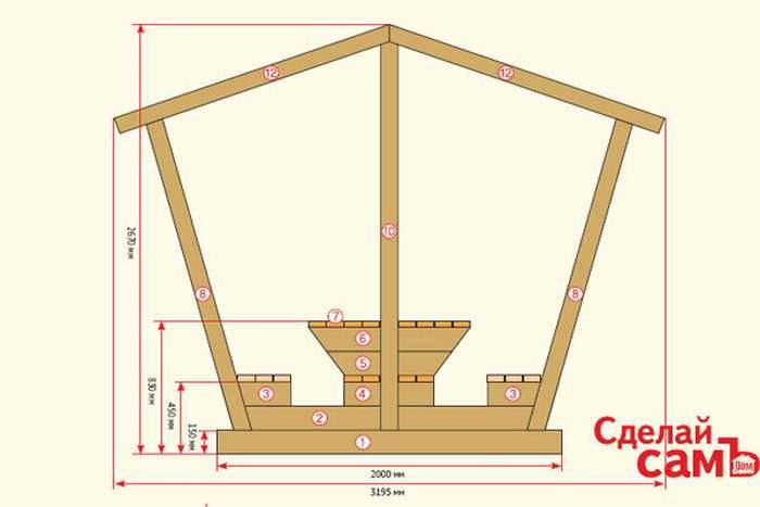 À partir du même matériau, vous pouvez construire des bancs autour du périmètre du belvédère et créer une table. Les dessins et le calcul des matériaux pour un gazebo hexagonal sont sur la photo ci-dessus.​