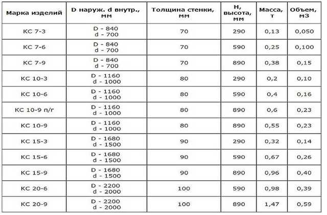 Il est d'usage de déterminer la taille des anneaux pour le puits par le diamètre intérieur. C'est lui qui est indiqué lors du marquage. Le diamètre extérieur peut être plus grand ou plus petit - selon que l'anneau est de résistance normale ou renforcé. Le tableau montre les paramètres pour les produits de résistance normale.