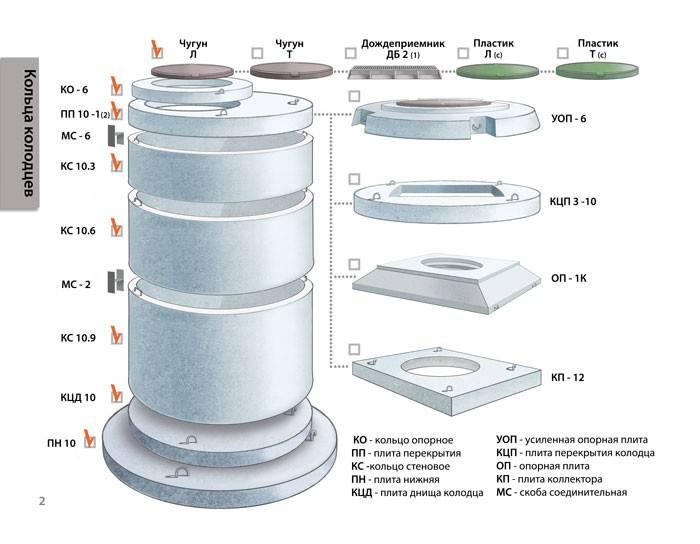 Les anneaux en béton sont utilisés dans la construction de puits à diverses fins. Abreuvoirs, égouts, colonnes de déchets et réservoirs de sédimentation, les réservoirs en sont collectés. Ils construisent également des réservoirs de sédimentation des égouts, des fosses septiques. GOST 8020-90 définit tous les types de produits pour la fabrication de réseaux et de puits en particulier. Tous ne sont pas utilisés dans la vie de tous les jours. Les types d'anneaux les plus couramment utilisés sont :