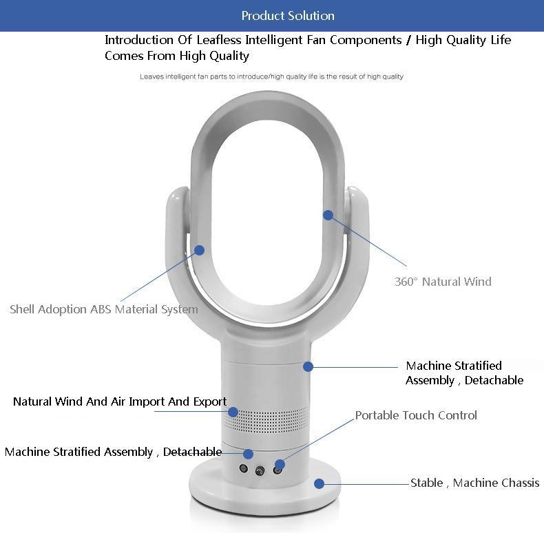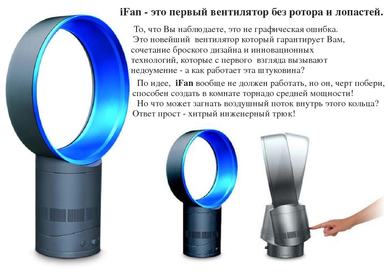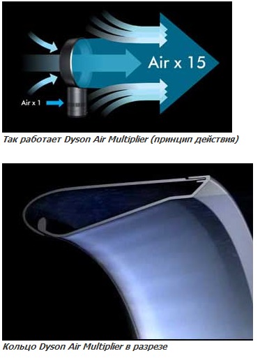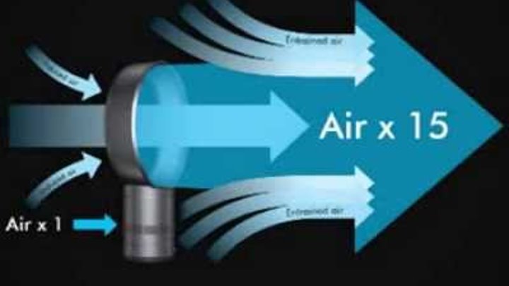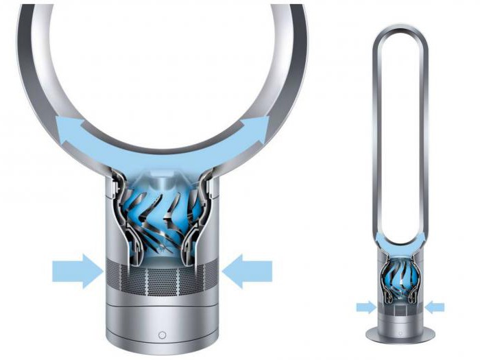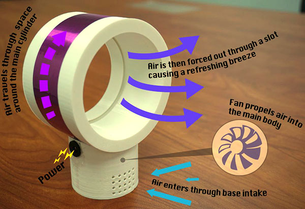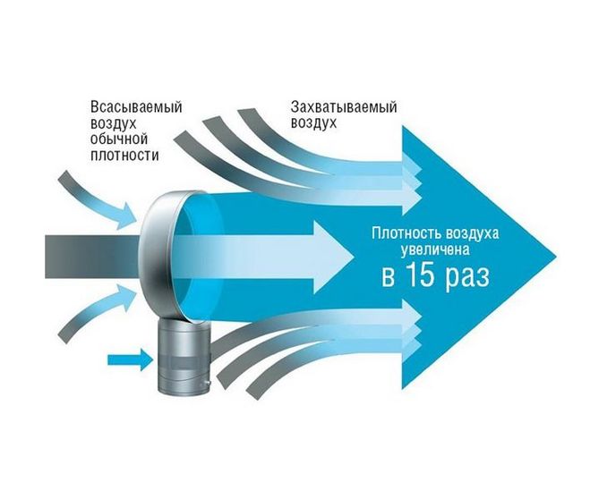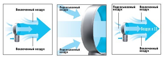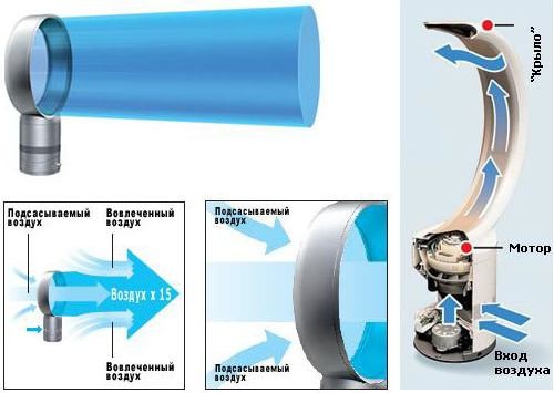 Le principe d'un fonctionnement aussi efficace d'un ventilateur sans pale est la multiplication répétée de l'air aspiré en sortie.Cela est dû à la forme particulière du ventilateur et à la présence d'un canal creux de forme spéciale à l'intérieur.