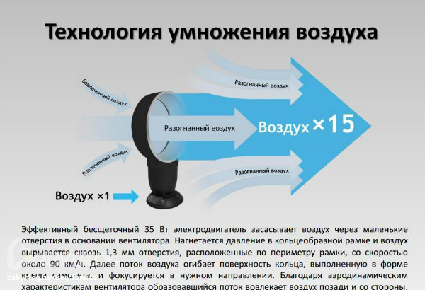 Les ventilateurs sans lame sont capables de faire passer jusqu'à 500 litres d'air en 1 seconde. Le flux de sortie est uniformément réparti, enveloppant doucement tout l'espace. Lors de l'inspection visuelle, les pièces mobiles à l'extérieur de l'appareil de commande ne sont pas observées. Voici à quoi ressemble un multiplicateur d'air à première vue.