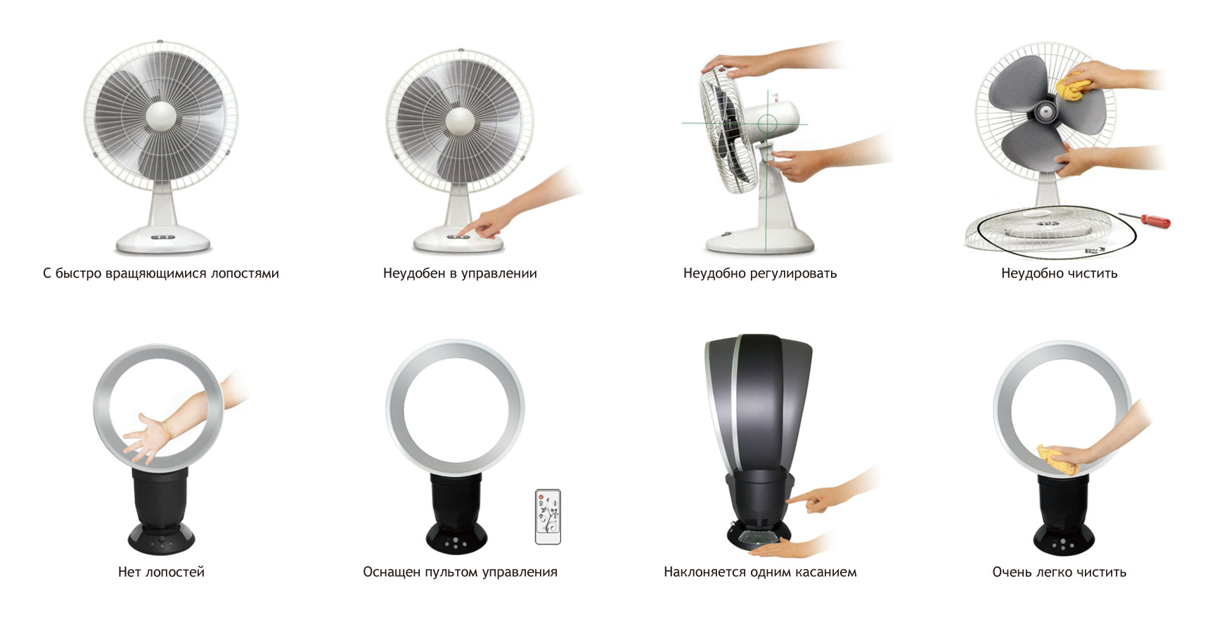 Certains modèles (par exemple, Flextron FB1009, KITFORT KT-401, HJ-007, Bork) ont un moteur intégré (Fig. 5), qui vous permet de changer la direction de l'anneau et, par conséquent, l'air couler. Certains fabricants ont prévu la possibilité d'installer un aérosol spécial dans la conception, en conséquence, l'Airmultiplier Dyson (c'est ainsi que Dyson a appelé son idée originale) agit en outre comme un assainisseur d'air (partie du modèle Kitfort, Supra, Renova, Vesson intervalle).