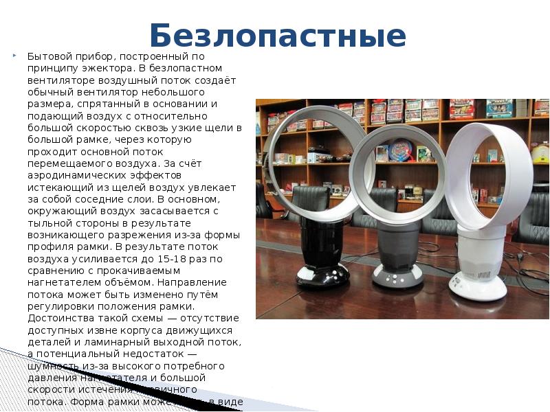 Il existe des ventilateurs sans pales avec refroidissement et chauffage par air; ces appareils électroménagers peuvent être tout à fait classés comme des équipements de climatisation à part entière.
