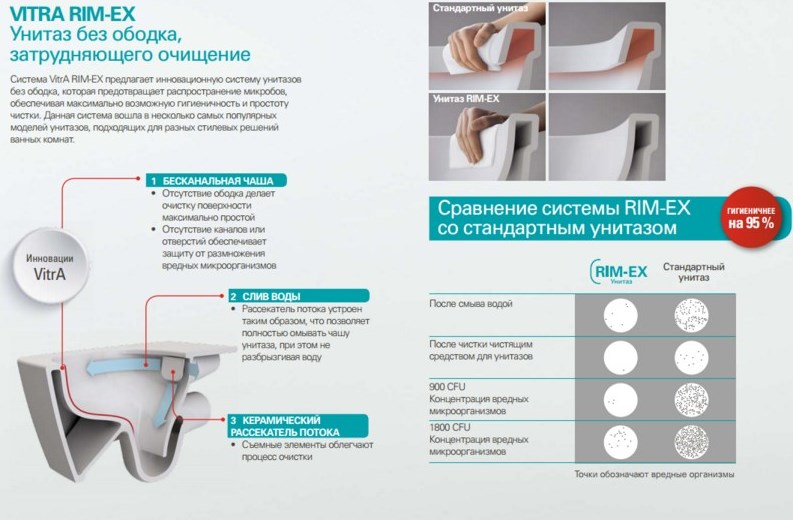 Les cuvettes de toilettes Vitra ont également reçu des critiques positives. Ce fabricant est spécialisé dans la fabrication d'appareils sanitaires pour salles de bains et de produits connexes. Toutes les toilettes sans rebord sont équipées du système de chasse d'eau Rim-ex. De telles conceptions conviennent non seulement à un usage domestique.Ils sont souvent installés dans des lieux publics, tels que des hôpitaux, des centres commerciaux ou de divertissement.