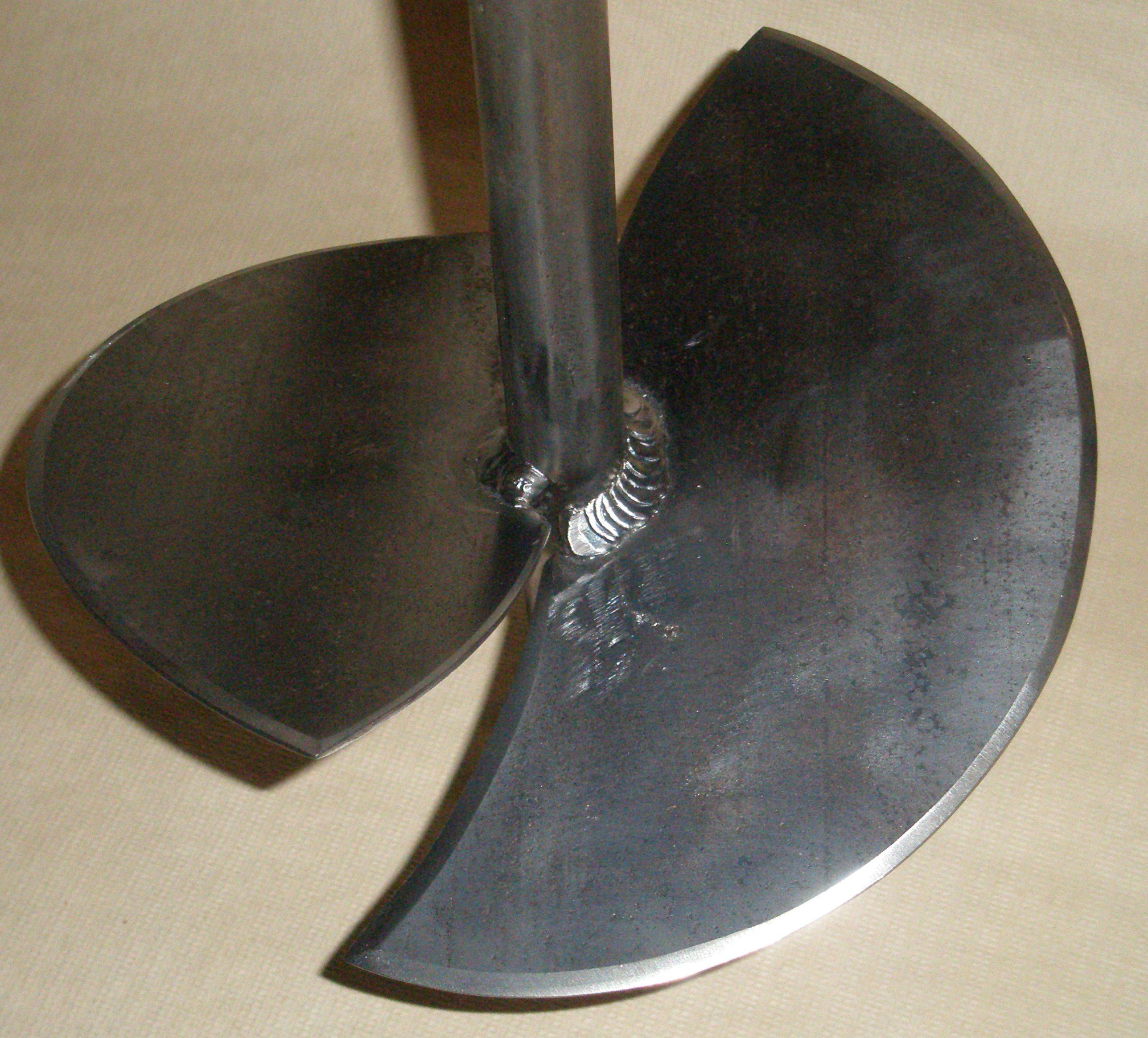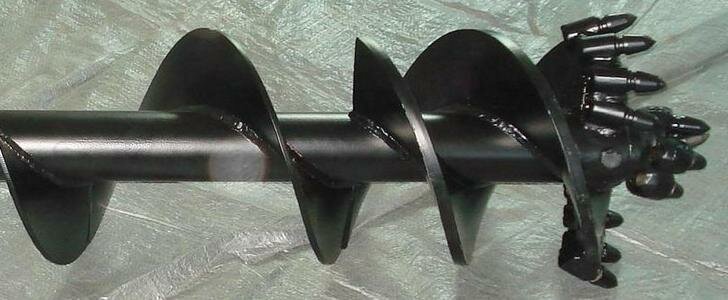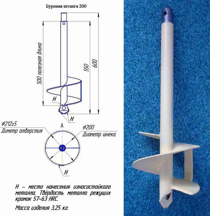 La perceuse hélicoïdale a un deuxième nom - perceuse à tarière. Il s'agit d'une tige d'un diamètre de 40 à 60 mm en métal durable avec une extrémité pointue et deux couteaux à tôle (disques sciés en deux) de 1,5 à 4 mm d'épaisseur, situés à un angle de 20 degrés par rapport à l'axe de la tige .