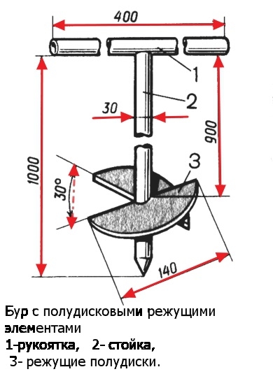 La perceuse pour puits est en métal. La perceuse elle-même est une structure constituée d'une tige métallique avec une extrémité affûtée. Les couteaux sont fixés sur les côtés de la perceuse. Pour les cavités de couteau, des moitiés d'un disque métallique d'environ 15 cm d'épaisseur peuvent être utilisées, puis les couteaux doivent être soudés à la tige avec une inclinaison d'environ 22 degrés. Les moitiés de disque sont placées l'une en face de l'autre. Entre les lames parallèles, la pente doit être de 44 degrés.