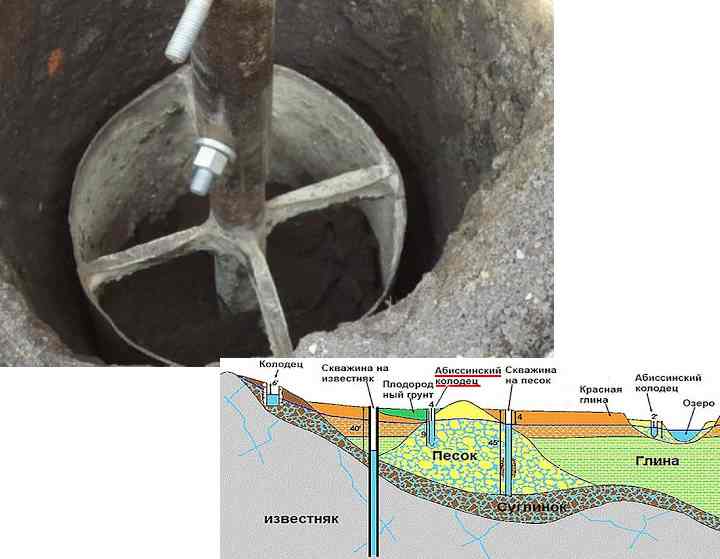 La terre fait son chemin jusqu'à la profondeur requise jusqu'à l'aquifère. Pour ce que vous pouvez utiliser un tuyau en pouces avec une pointe fine à la fin. Une pompe auto-amorçante est fixée au tuyau entraîné, elle créera un vide. Si ce puits ne produit pas assez d'eau, plusieurs puits abyssins peuvent être installés sur le site.