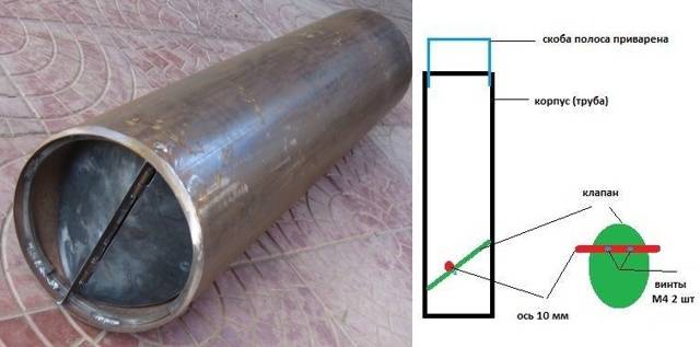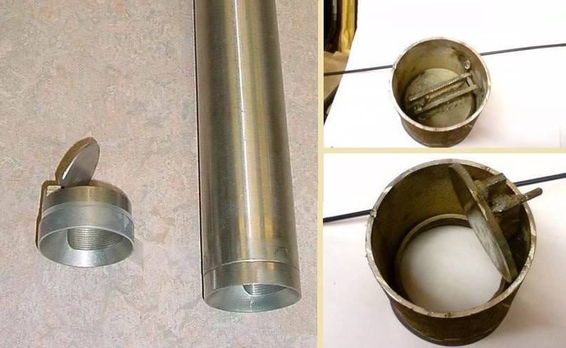 La valve est découpée dans du plastique. C'est une ellipse. Le plus petit diamètre de l'ellipse est égal au diamètre du tuyau. Il doit être coupé très précisément afin que lorsqu'il est inséré à l'intérieur, il s'adapte parfaitement aux murs. La valve de découpe au milieu sera fixée au boulon; pour cela, quatre trous sont pratiqués dans le plastique à travers lequel le fil est enfilé. La façon dont tout cela s'assemble est montrée sur la photo ci-dessous à gauche.