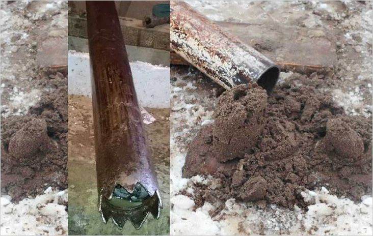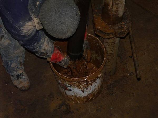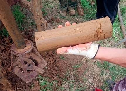 Pour extraire la carotte, l'outil de forage est remonté à la surface.Le sol capturé par celui-ci est littéralement soufflé hors de la carotteuse avec un jet d'air fourni à la partie supérieure du tuyau. Le processus de soufflage est accéléré en tapotant le projectile avec un marteau.