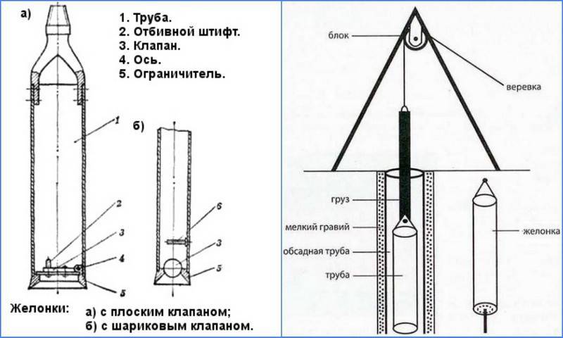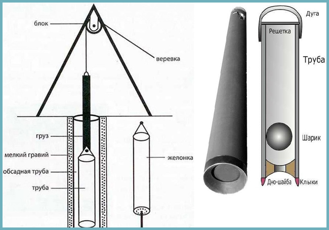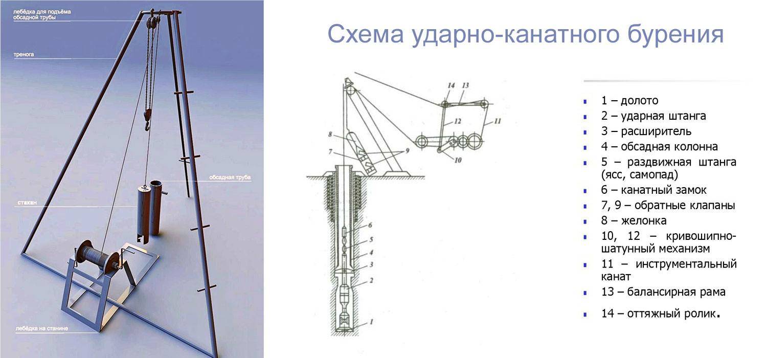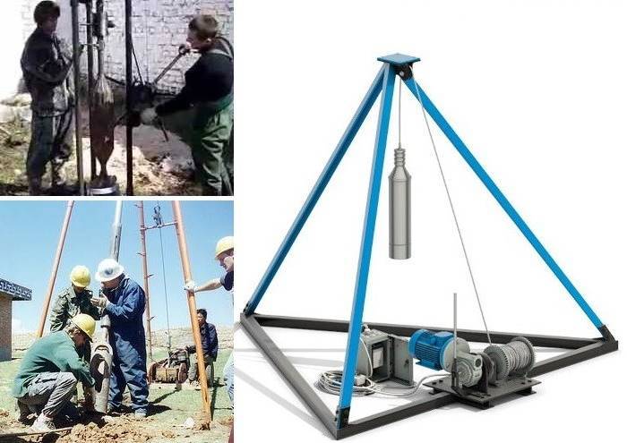Le travail de l'appareil consiste à abaisser et à relever un verre rempli de terre, et la séquence de création d'un puits à l'aide de la méthode de la corde à choc est la suivante: