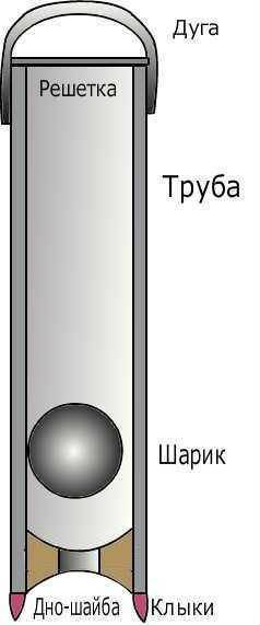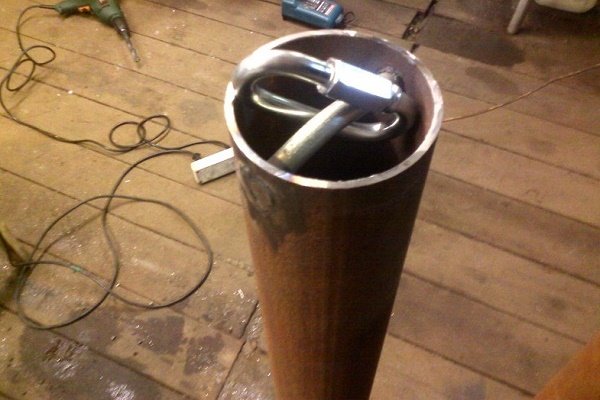 La partie étroite de la transition est insérée dans le tuyau et soudée. La balle est lancée vers l'intérieur, le bouchon est soudé. Et la touche finale est de faire un support pour un câble ou une ficelle. Tout, l'écope à faire soi-même est prête.