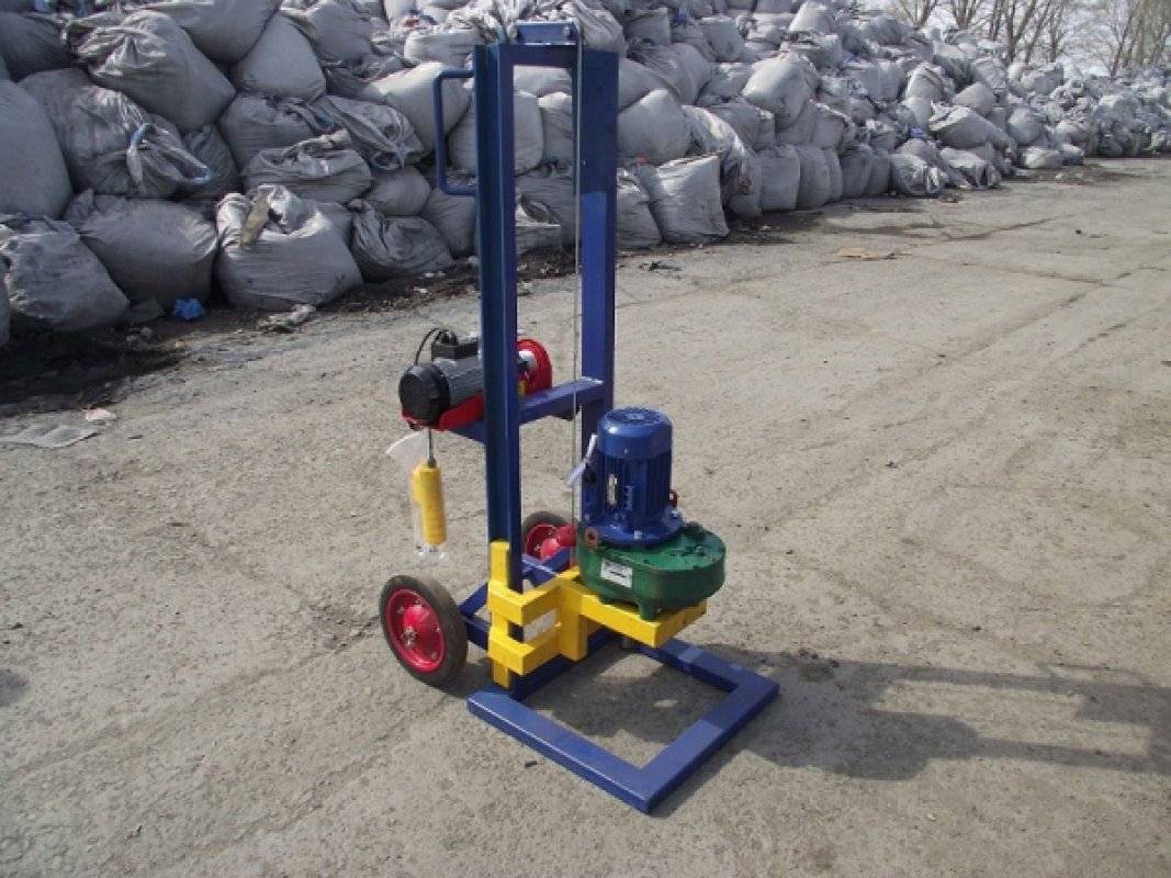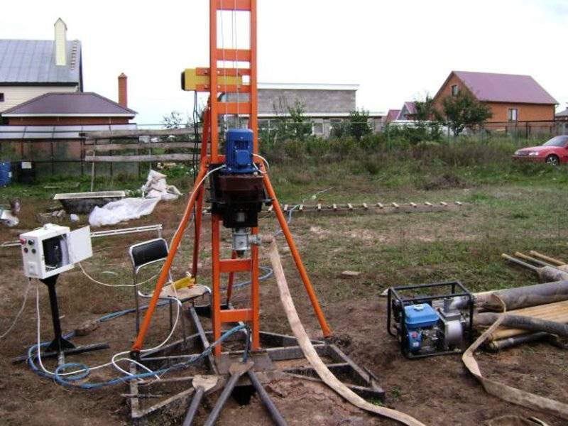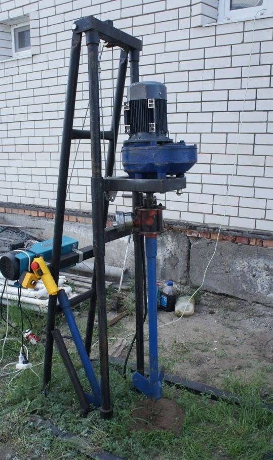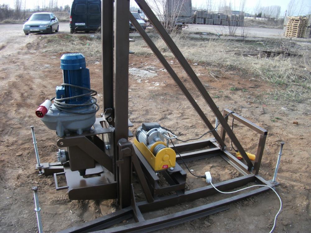 L'appareil pour ce type de forage est un trépied de deux mètres, sur lequel un bloc est installé avec un câble jeté dessus. Une écope est fixée à l'extrémité du câble - un outil de coupe et de préhension. L'écope «écope» la terre, puis elle est soulevée avec un câble et nettoyée à travers un trou technologique spécial. Pour simplifier le processus, de l'eau est versée dans le puits, qui est ensuite retirée.
