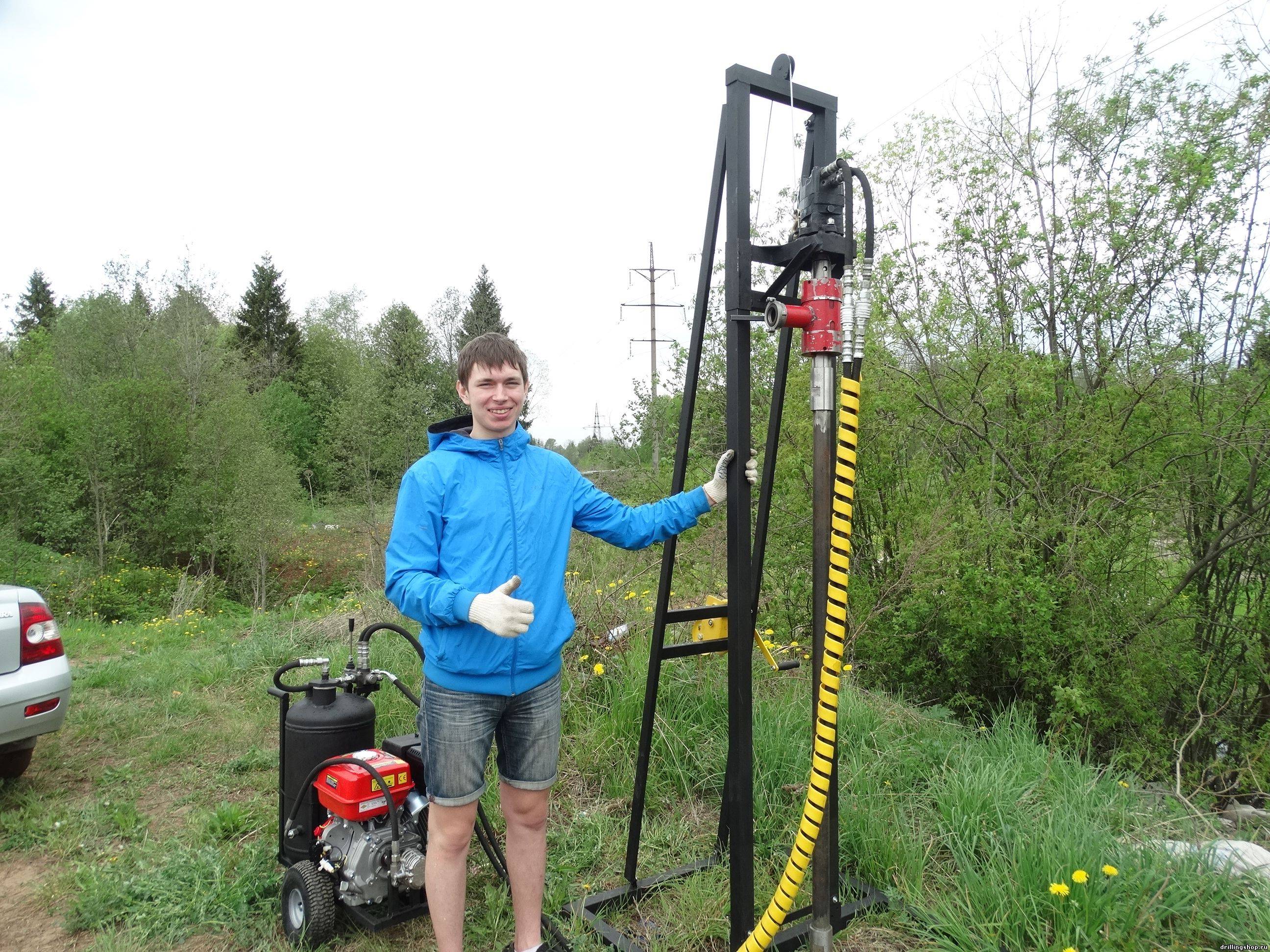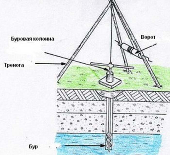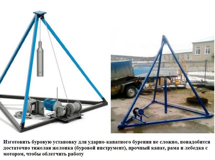 Il est possible de forer un puits dans la zone non seulement en faisant tourner la foreuse, mais également par la méthode de la corde à choc. Pour ce type de travail, une installation spéciale est nécessaire, qui peut également être réalisée indépendamment de matériaux improvisés.