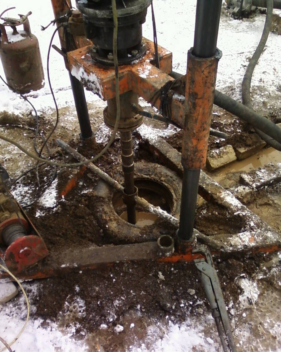 Un morceau de tuyau ou une tige métallique est soudé dans la partie supérieure de la structure de la cuillère pour attacher une perceuse avec une tige et plus loin avec la poignée pour la rotation. Le train de tiges est construit de la même manière que lors du forage à la tarière pour l'eau.