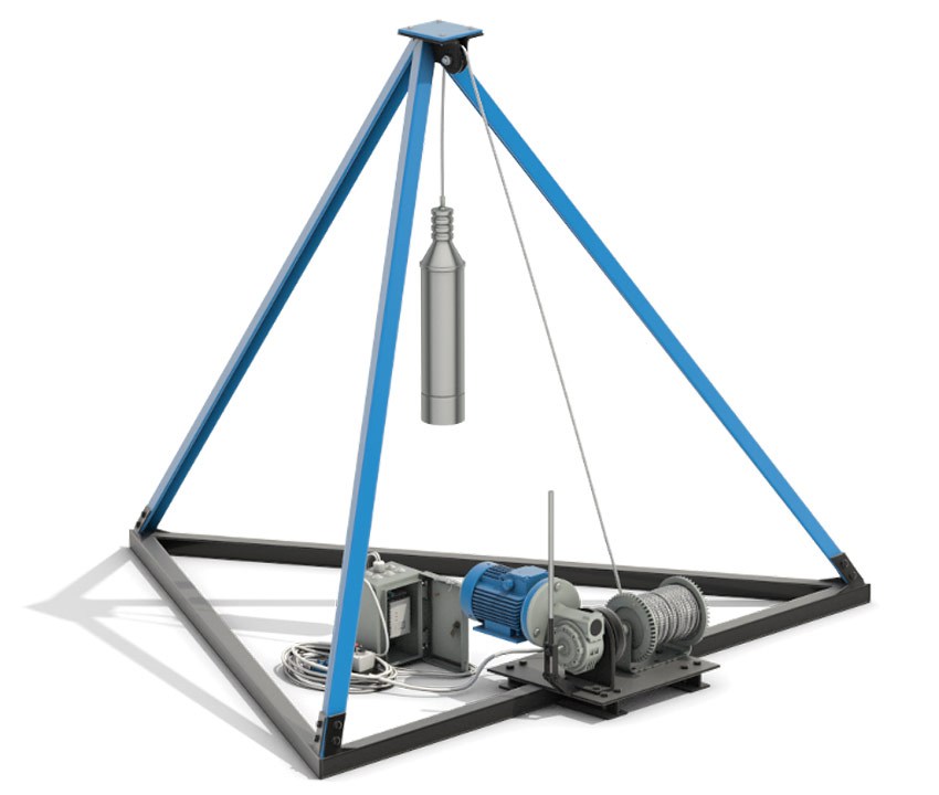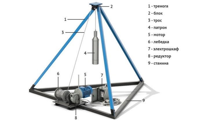 - Nous installons un trépied à 2-3 mètres de haut au-dessus du trou. Nous équipons le haut du trépied d'un bloc bien fixé pour la corde. Vous aurez également besoin d'un treuil, que nous attachons aux supports. C'est bien si vous avez un treuil électrique, mais un manuel fonctionnera aussi.