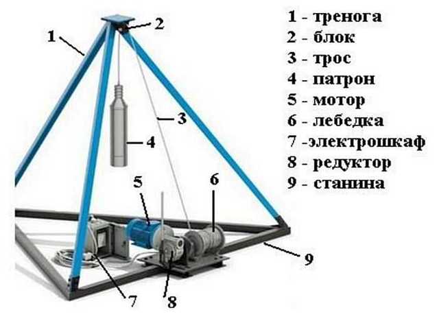 Pour forer un puits avec un câble à percussion, vous n'avez pas besoin de tant de choses : un cadre de trépied stable, la perceuse à percussion elle-même, un câble solide et un treuil