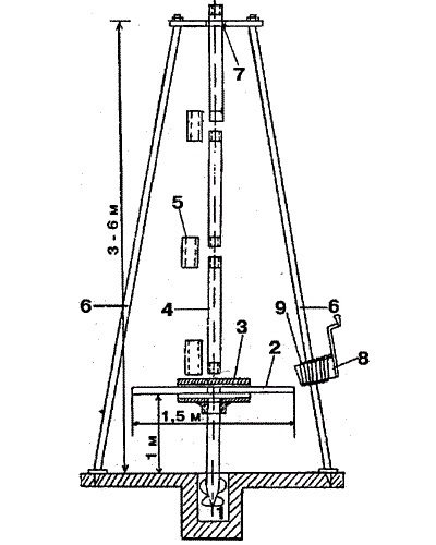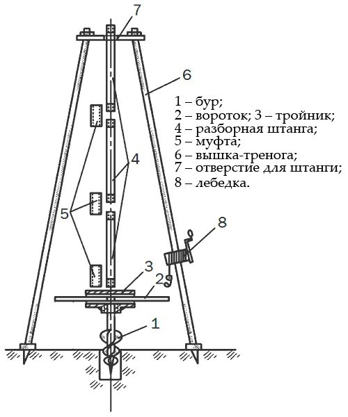 S'il est prévu de construire un puits plus profond que 800 cm, fixez la structure sur un trépied. Au sommet d'une telle tour, il devrait y avoir un trou suffisamment grand pour le mouvement sans entrave de la tige.