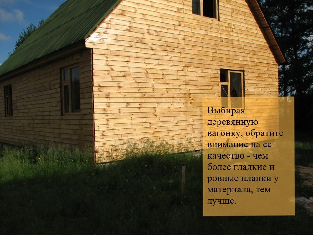 Doublure en bois. Un tel matériau est bien adapté pour recréer l'essence bois de la maison. En apparence, c'est une planche plate en bois, qui peut être trahie dans différentes nuances. Un tel matériau de finition est facilement monté à l'aide de pointes spéciales qui relient les planches sur la longueur. Il est respectueux de l'environnement, durable, possède des propriétés d'isolation thermique et acoustique. L'inconvénient de la doublure en bois peut être appelé sensibilité à divers insectes, ce qui oblige à recouvrir ce matériau d'un agent protecteur spécial. De plus, cette finition doit être teintée à des intervalles d'environ une fois tous les trois ans ;