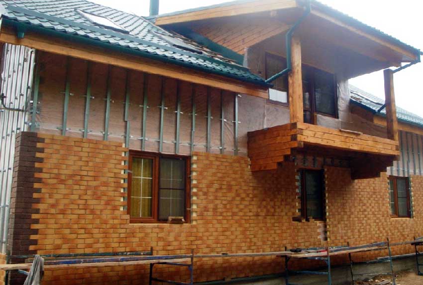 - La décoration de la façade d'une maison en bois est réalisée sous la forme d'un mur de briques, à une certaine distance de la surface principale du bâtiment. Le mur de finition doit être relié au mur principal par des joints flexibles. Ils sont réalisés sous forme d'ancres en polymères ou en fil galvanisé. Cela permet à la maçonnerie de finition de maintenir sa position lors des mouvements de terrain saisonniers.