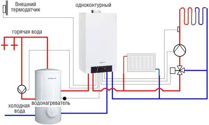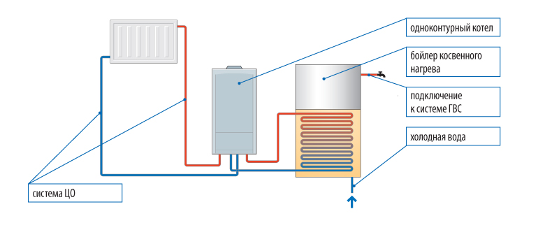 Si une chaudière à circuit unique est déjà installée, une chaudière de chauffage à couches spéciale peut être achetée pour celle-ci, qui est équipée d'un réchauffeur de liquide à circulation. Si vous avez besoin de gagner de la place dans l'appartement, vous pouvez opter pour une chaudière à circuit unique avec une chaudière à chauffage indirect intégrée.