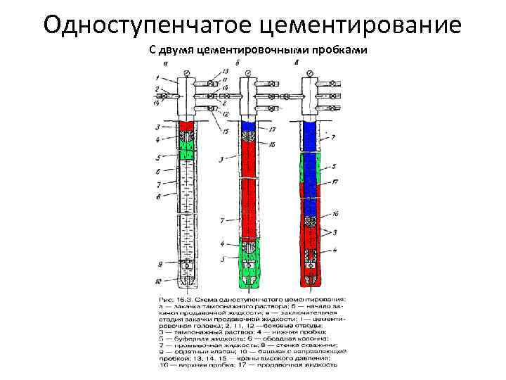 Cimentation en une étape - le coulis de ciment est pompé dans le volume nécessaire pour remplir l'intervalle spécifié de l'espace annulaire du puits et de la section OK. sous le clapet anti-retour et le liquide de compression - dans la quantité nécessaire pour remplir la cavité interne de la colonne au-dessus du clapet anti-retour. La densité du coulis de ciment doit être supérieure à la densité du fluide de forage.