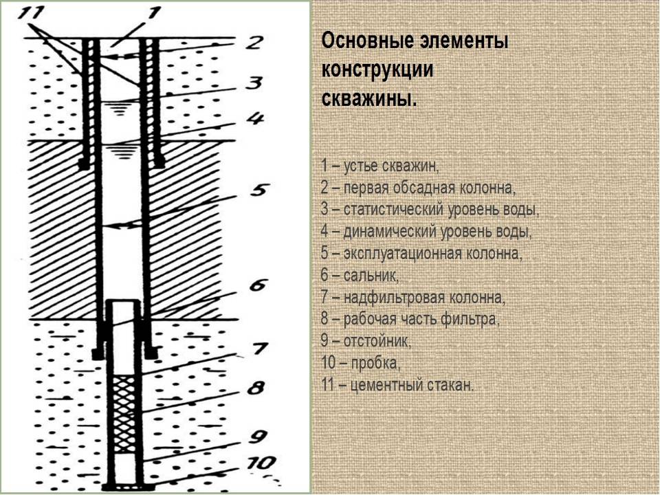 Analyse de puits, au cours de laquelle la profondeur du puits et la taille de l'écart entre les parois du puits et le tubage sont mesurées. La géométrie de l'ensemble de la structure est vérifiée. Les caractéristiques du sol sont clarifiées - types de roches, porosité, fracturation et autres propriétés géologiques et hydrogéologiques.